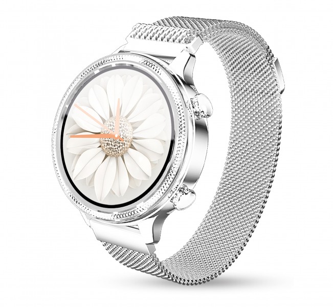 Designové kovové tělo z lehké slitiny s vypracovanými detaily. Plně dotyková kulatá obrazovka, senzory pro fitness a zdraví, upozornění, exkluzivní funkce pro ženy a mnoho dalšího. V balení neschází sada řemínků – kovový i barevný.