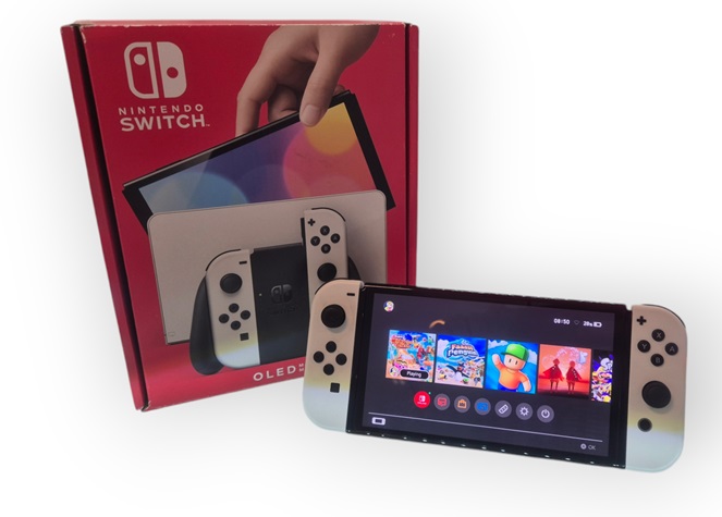 Herní konzole - hybridní (do ruky / k TV), nový procesor Tegra od NVIDIA, kvalitnější 7" OLED displej, baterie 4310 mAh, rozšiřitelná interní paměť 64 GB, slot pro paměťové karty, integrovaný stojánek, dokovací stanice s LAN portem, konektor HDMI, multifunkční ovladače Joy-Con, pokročilá vibrační odezva, IR kamera, pohodlné trackpady, lokální multiplayer, online herní režimy, snadné spárování až 8 konzolí, barva bílá.