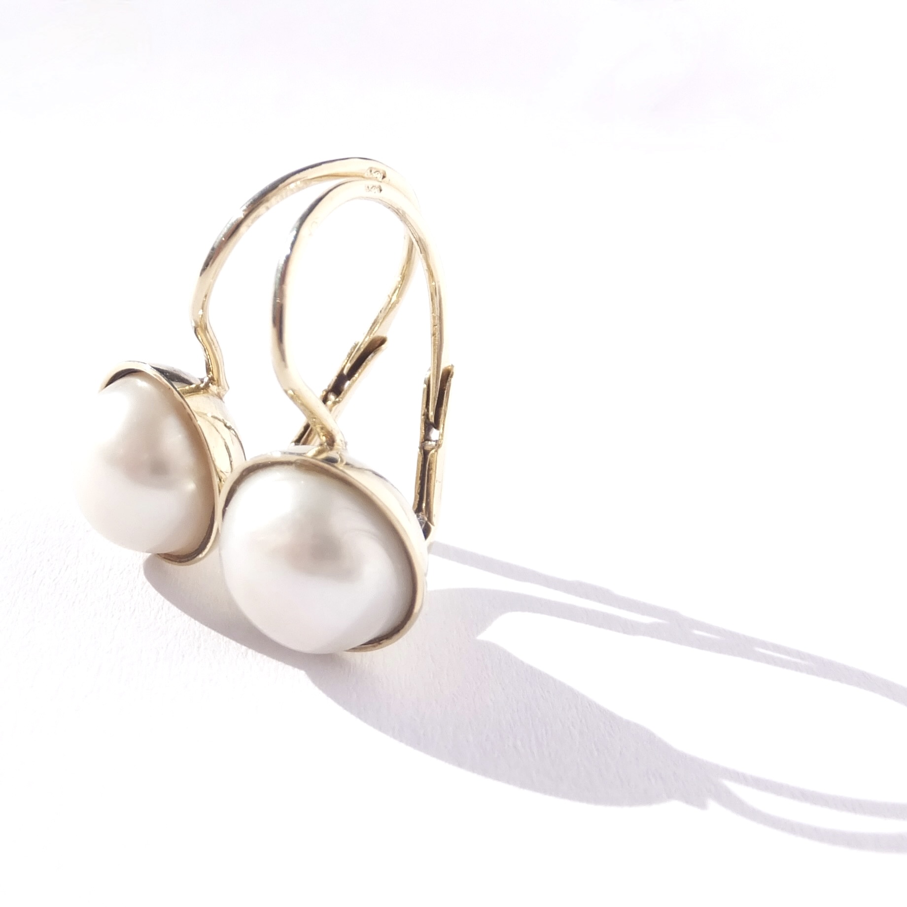Zlaté náušnice s matnými perlami. Zapínání na patent-klapka s pojistkou.