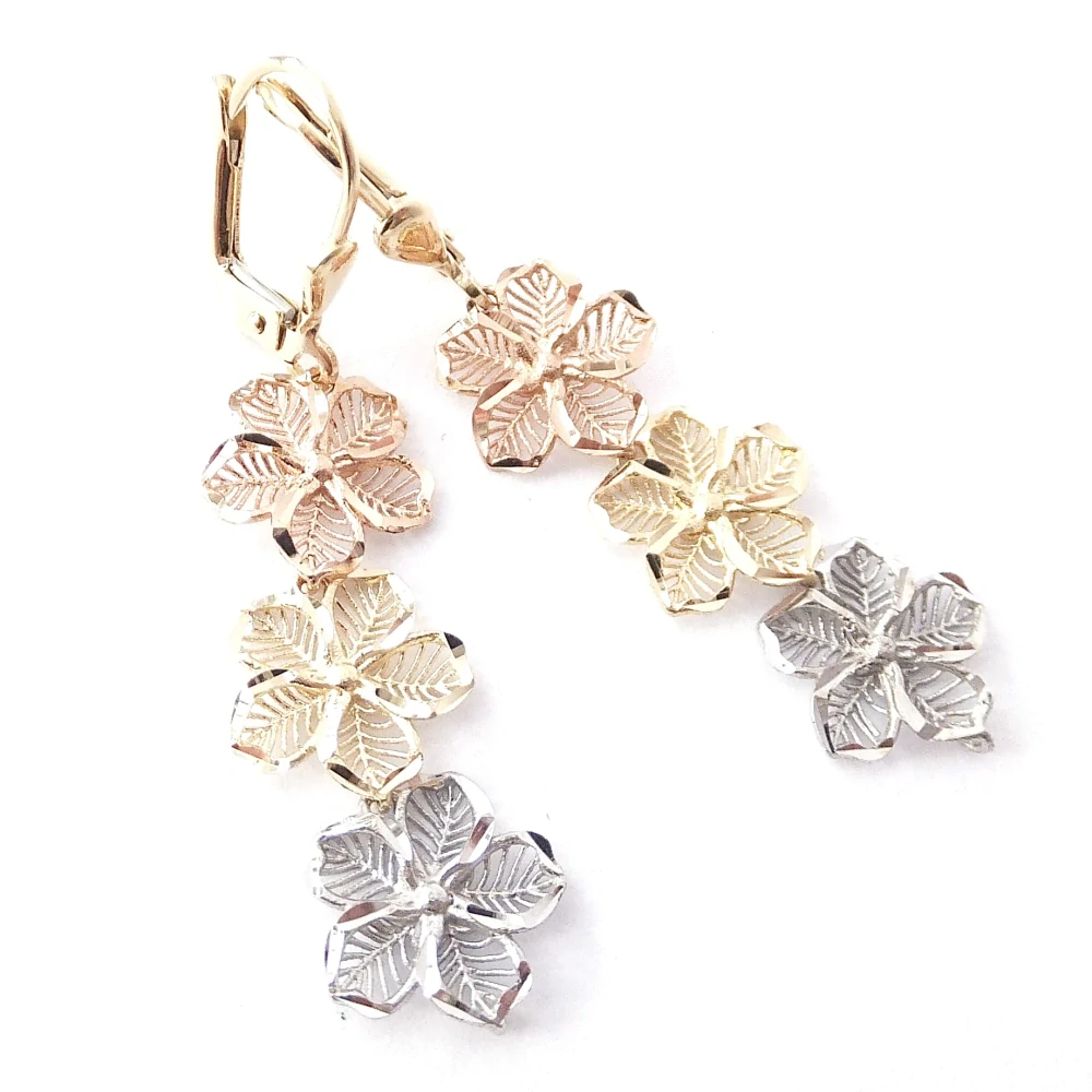 Nádherné zlaté náušnice s kytičkami. Kombinace žlutého, bílého a růžového zlata. Pohodlné zapínání na patent-klapka. Možnost koupě stejného náramku a náhrdelníku- čísla produktů M701, M702