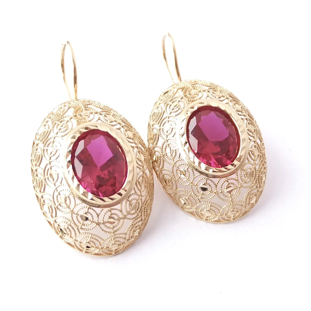 Výrazné zlaté visací náušnice s tmavě růžovými kameny. Zapínání na háček.