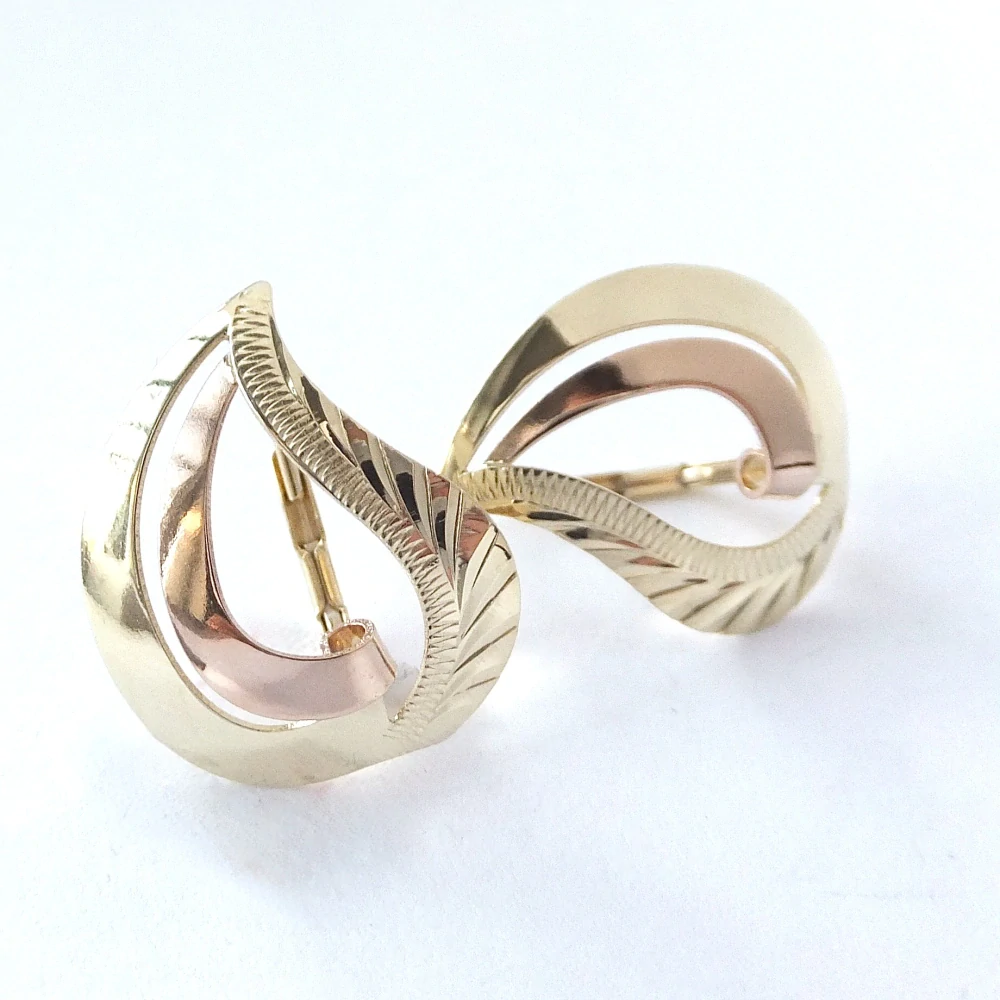 Zlaté, ručně dělané, elegantní náušnice s lesklou povrchovou úpravou. Kombinace žlutého a růžového zlata. Pohodlné zapínání na patent-klapka.