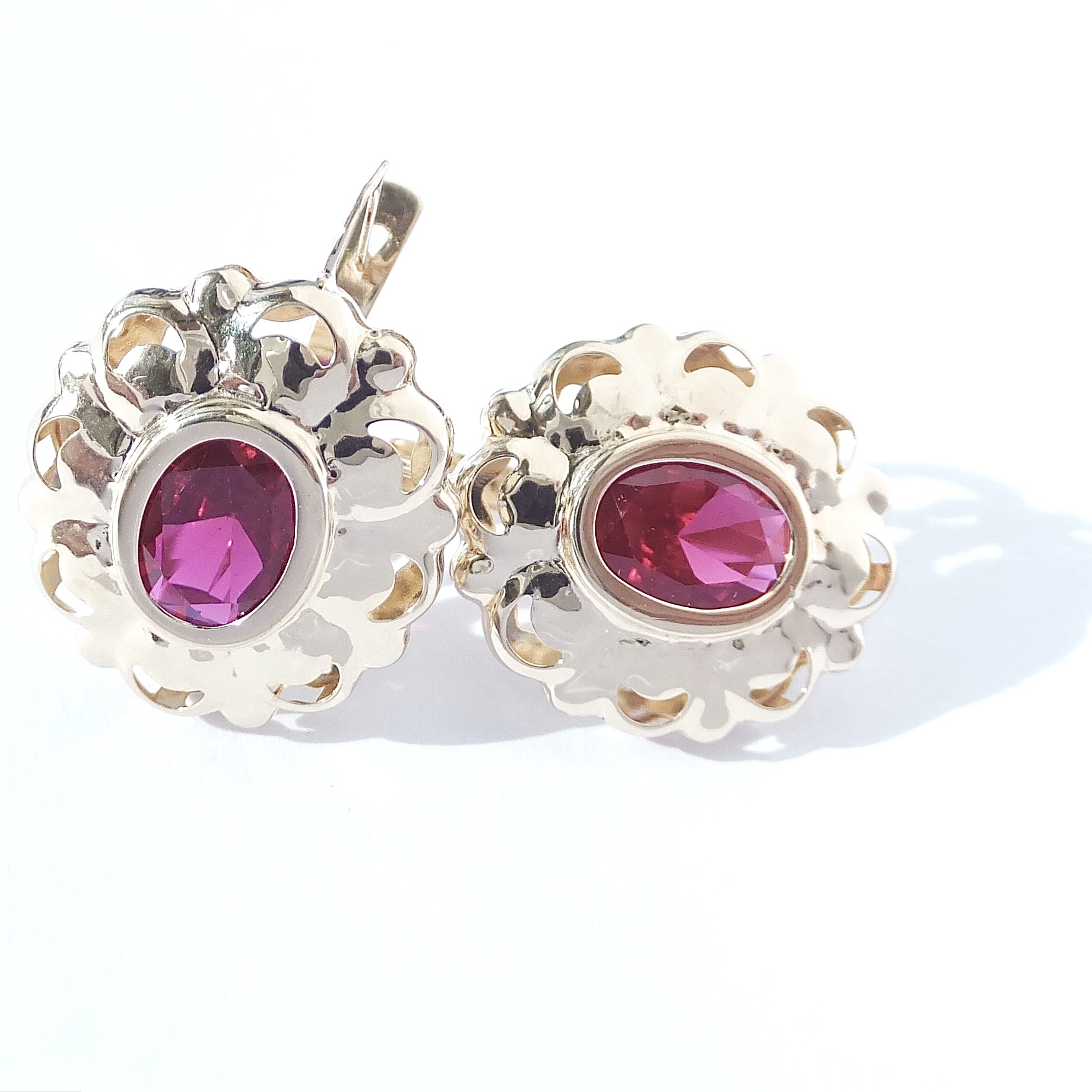 Elegantní zlaté náušnice s lesklou povrchovou úpravou. Náušnice jsou doplněné sytě růžovými kameny. Francouzské zapínání.