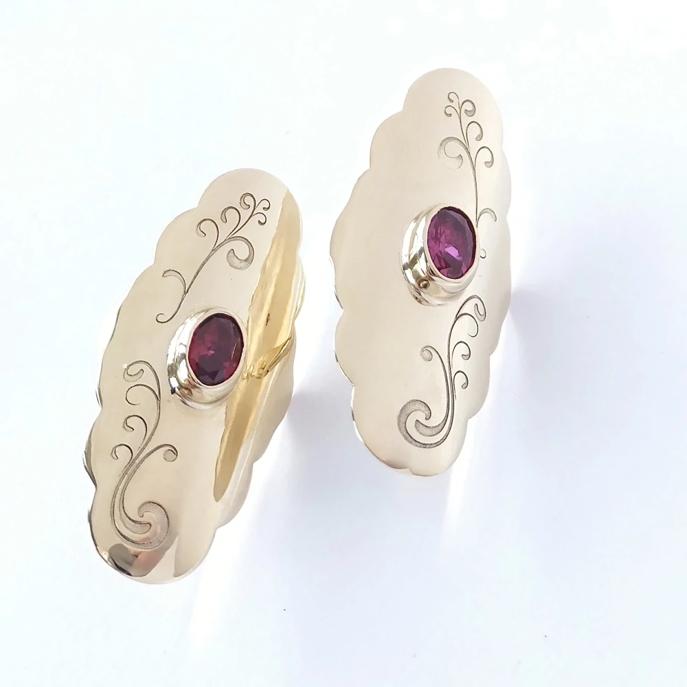 Zlaté visací náušnice, které jsou ručně zpracované. Lesklá povrchová úprava. Pohodlné zapínání na patent-klapka.