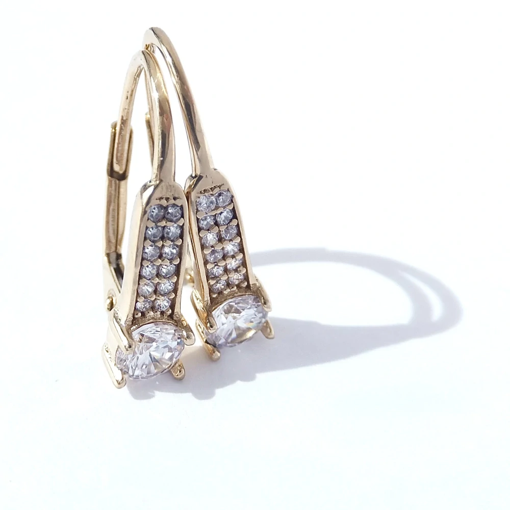Zlaté náušnice zdobené čirými zirkony. Zapínání na patent-klapka.