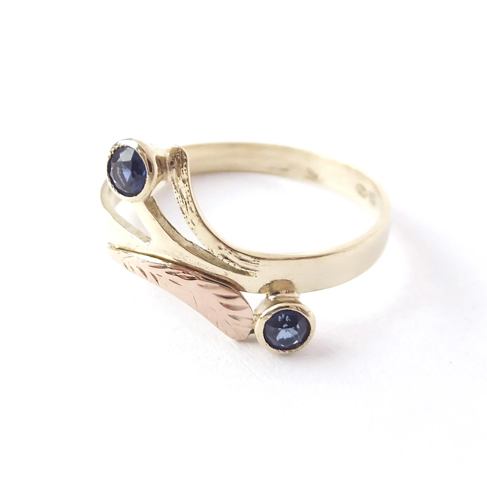 Zlatý prsten v kombinaci žlutého a růžového zlata. Prsten je dekorován dvěma tmavě modrými kameny.